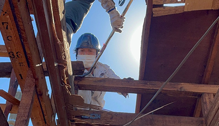 木造住宅の解体に伴う足場工事もお任せください。防炎シートで養生し、水や粉塵が飛ぶのを防ぎつつ、万が一の火災でも燃え広がらないため安心です。